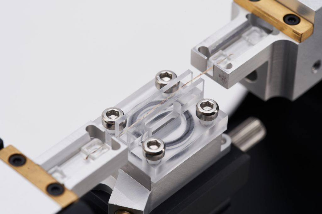 The LEX820 is a high-resolution extensometer, developed for brittle fibres that fail at low strain values. The DC micrometer-drive delivers exceptionally smooth travel, combined with a high positional repeatability required to capture accurate strain data. The LEX820 is supplied with either a 20N or 2N load cell which measure force data with an excellent linearity and low compliance. The open frame design means that it can also be used in conjunction with techniques such as X-Ray diffraction or neutron scattering. Additional modules allow for wet tensile measurements and interfacial sheer stress measurements.